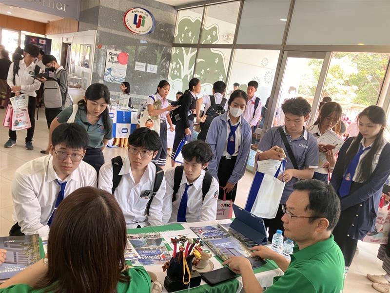 また、フェアに先立ち、日本式教育を導入する現地私立高校のハークケオ学園において、生徒約40 名を対象に、本学を含むフェア参加機関によるプレゼンテーションおよび個別相談を実施しました。同学園からは、これまでに留学フェアに参加した大学へ複数の生徒が進学しており、すでに MOU を締結した大学もあります。