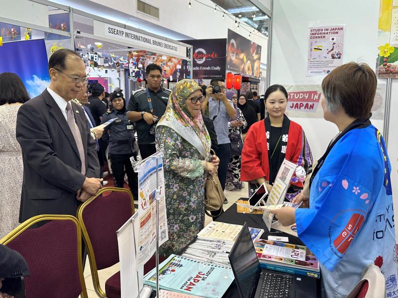 当ブースでは、ブルネイ元日本留学生会(BAJA)と連携し、日本留学に関する情報提供および個別相談を実施しました。学部や大学院への進学希望に加え、日本の高校進学を目指学生など、245名が来訪し、熱心に相談されました。また、在ブルネイ日本国大使館の菊田豊大使およびブルネイ文化青年スポーツ省のシティ・ノルカルビ副次官にもご視察いただき、関係者との挨拶を交わしました。