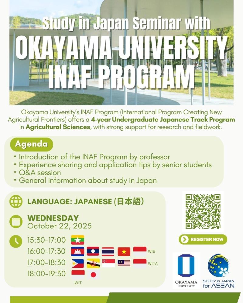 岡山大学農学部INAFプログラム × Study in Japan for ASEAN 日本留学オンラインセミナーのご案内